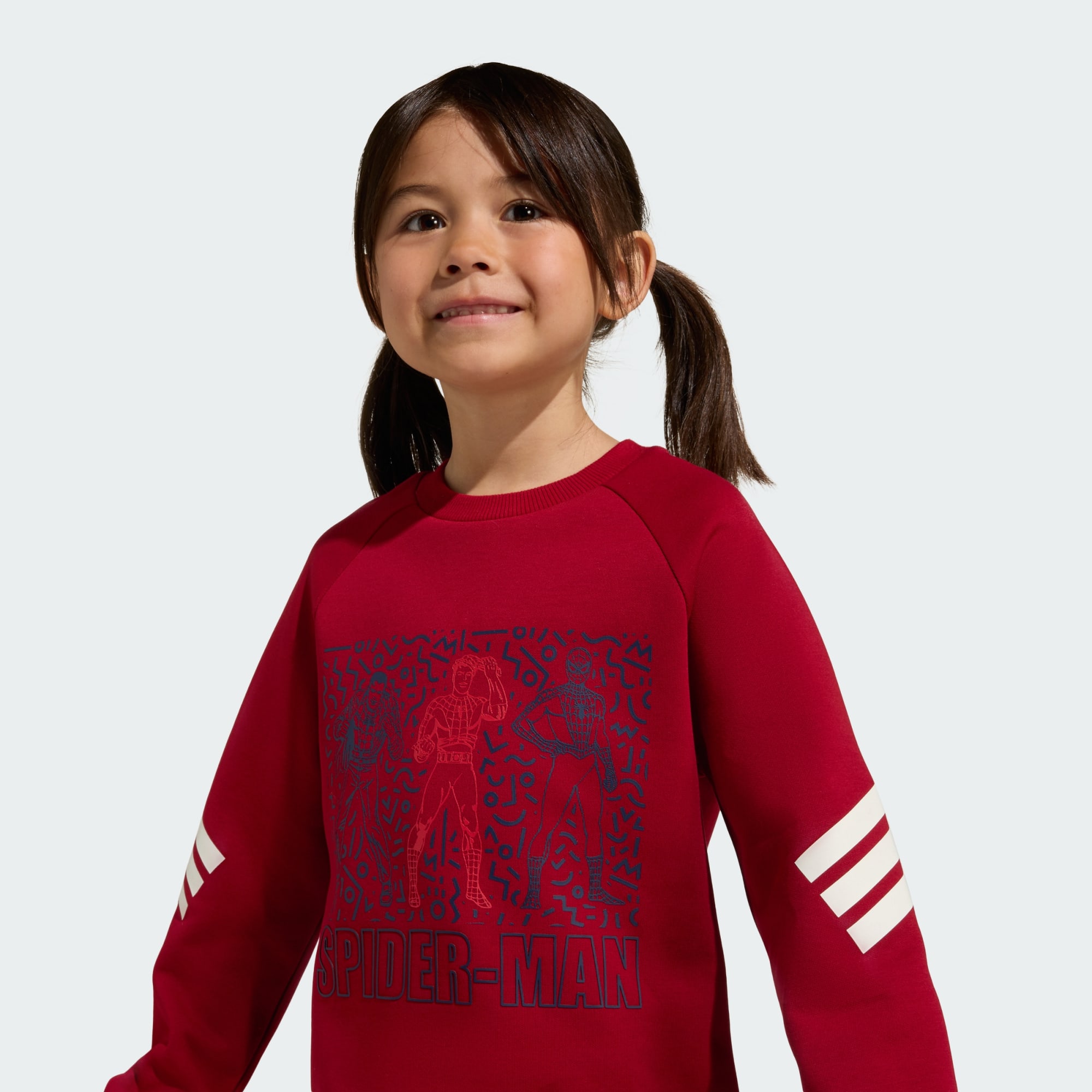 Created for young comic book fans with big imaginations. This adidas Marvel Spider-Man Jogger set displays an eye-catching two-colour print that captures the transformation from man to superhero. Crafted from soft interlock fabric, the top and bottoms will help keep them comfortable and ready for brand-new adventures. The ribbed crewneck collar adds a splash of style, while the drawcord-adjustable waist provides a secure fit. With 3-Stripes on each sleeve and a pair of 3 Bar Logos, this set will reveal their sporty style whenever they’re called out to save the world.