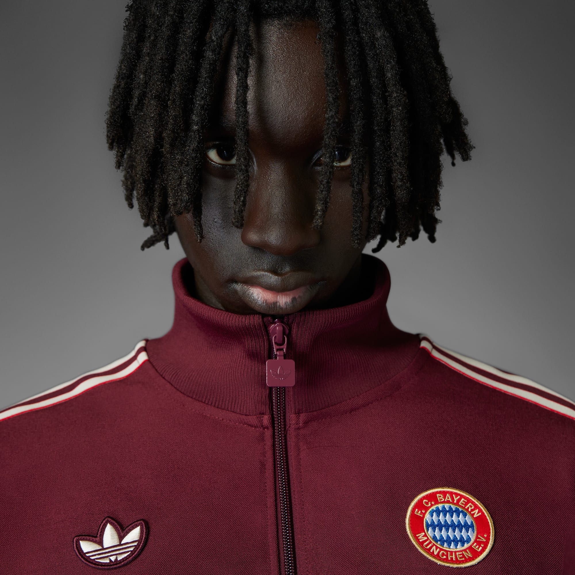A 1980s-style track top for FC Bayern fans, made in part with recycled materials.