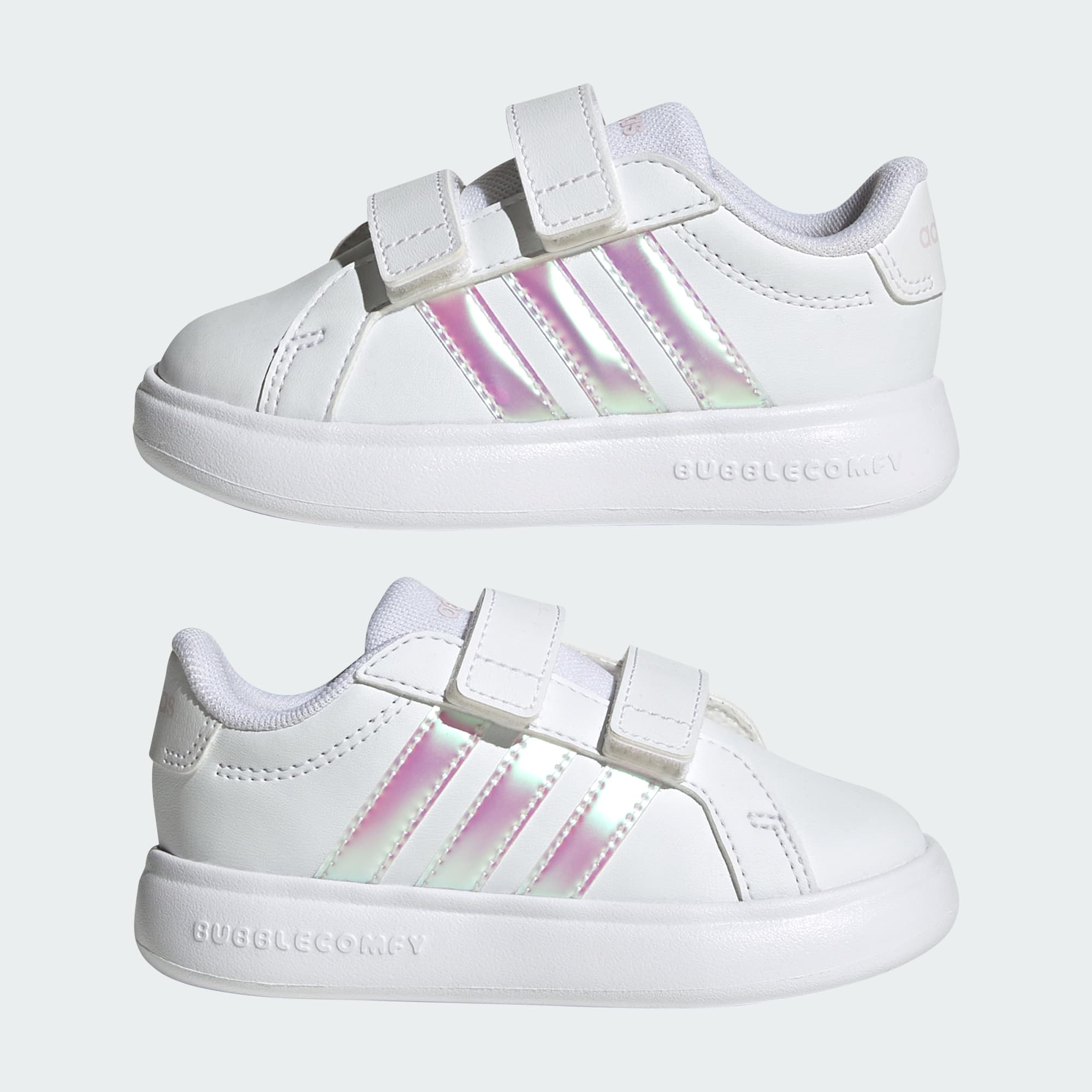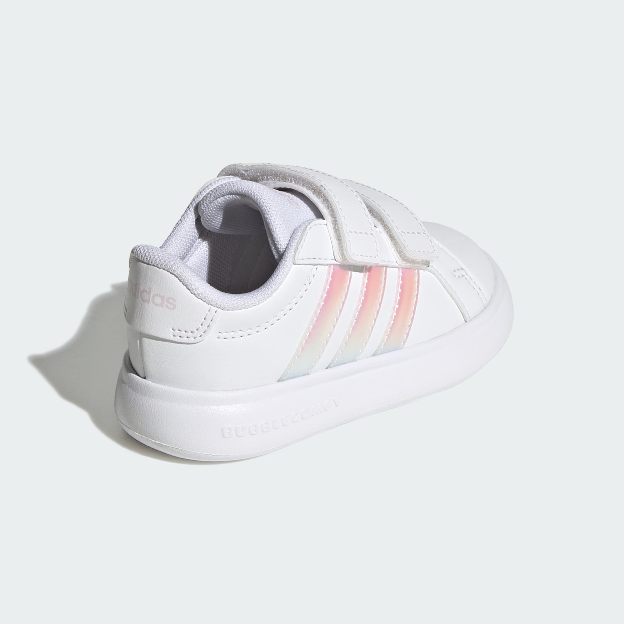 The Grand Court 3.0 Bubble Shoes have been designed to cushion little feet as they set off on their next adventure. Stylish and comfortable, they add a modern twist to adidas’ Sportswear court model. Crafted with a synthetic material upper and our softest one-piece sole, these shoes are sleek and durable. They have fully adjustable hook-and-loop straps, making them quick and easy to secure. adidas branding features prominently, with a logo on the heel and quarter 3-Stripes branding. Whether it's a day at the park or a stroll down the street, these shoes will keep up with your child’s active lifestyle.