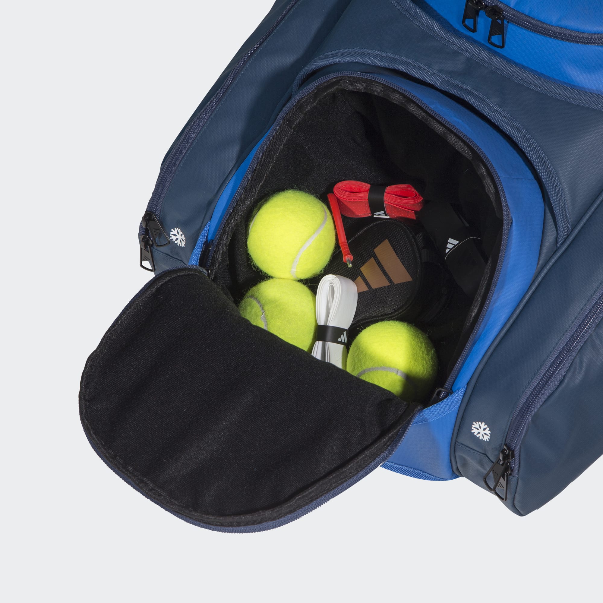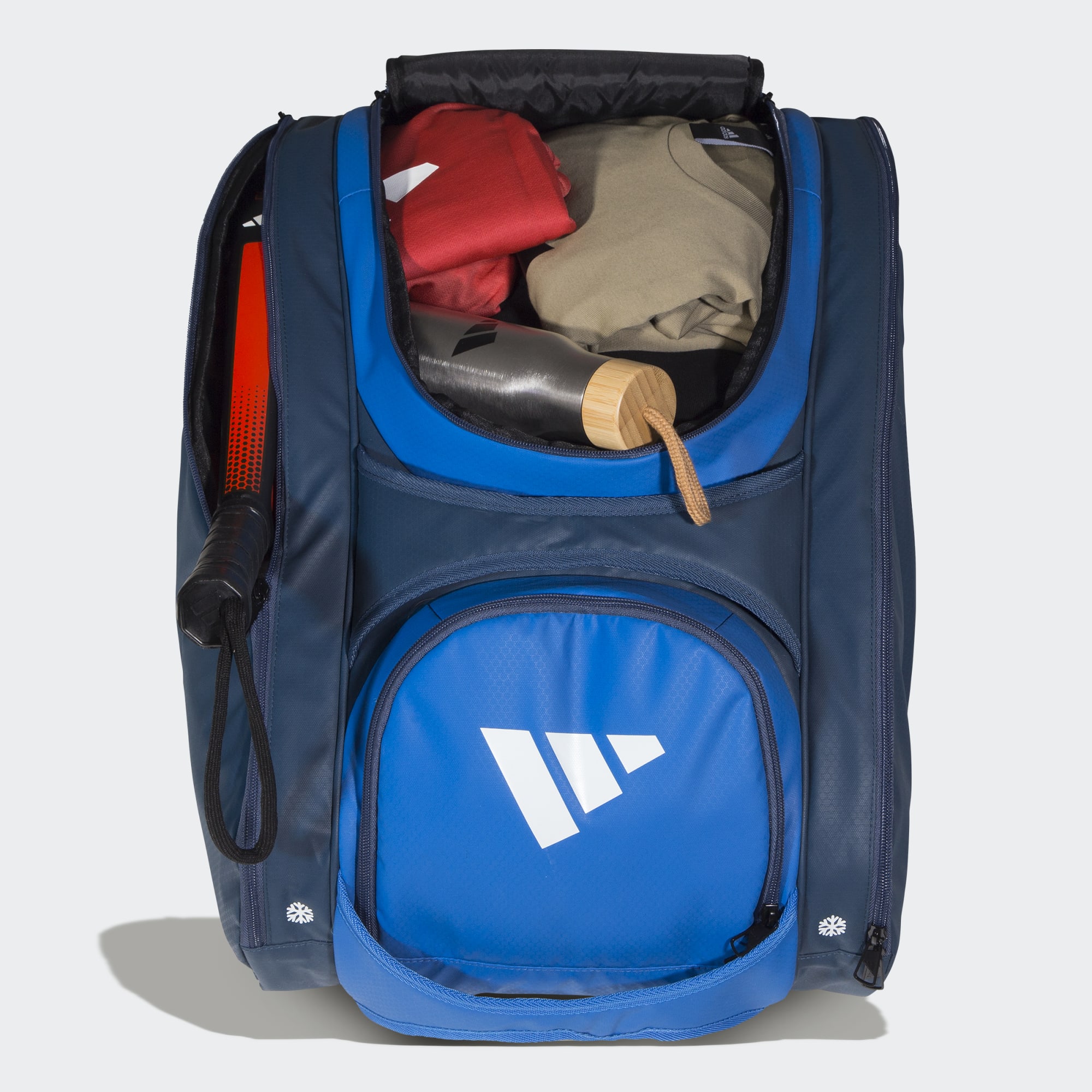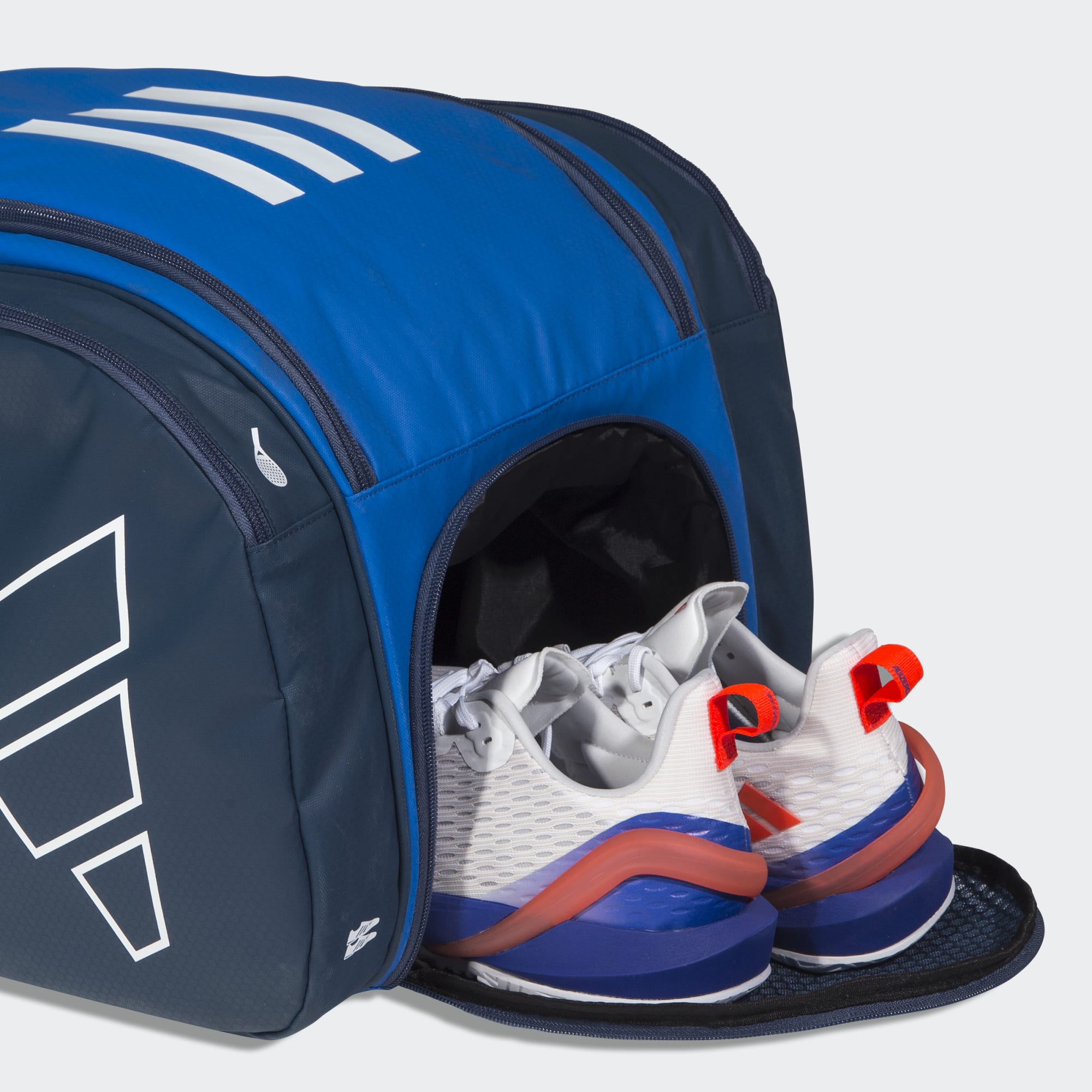 A large bag with storage for rackets and shoes.