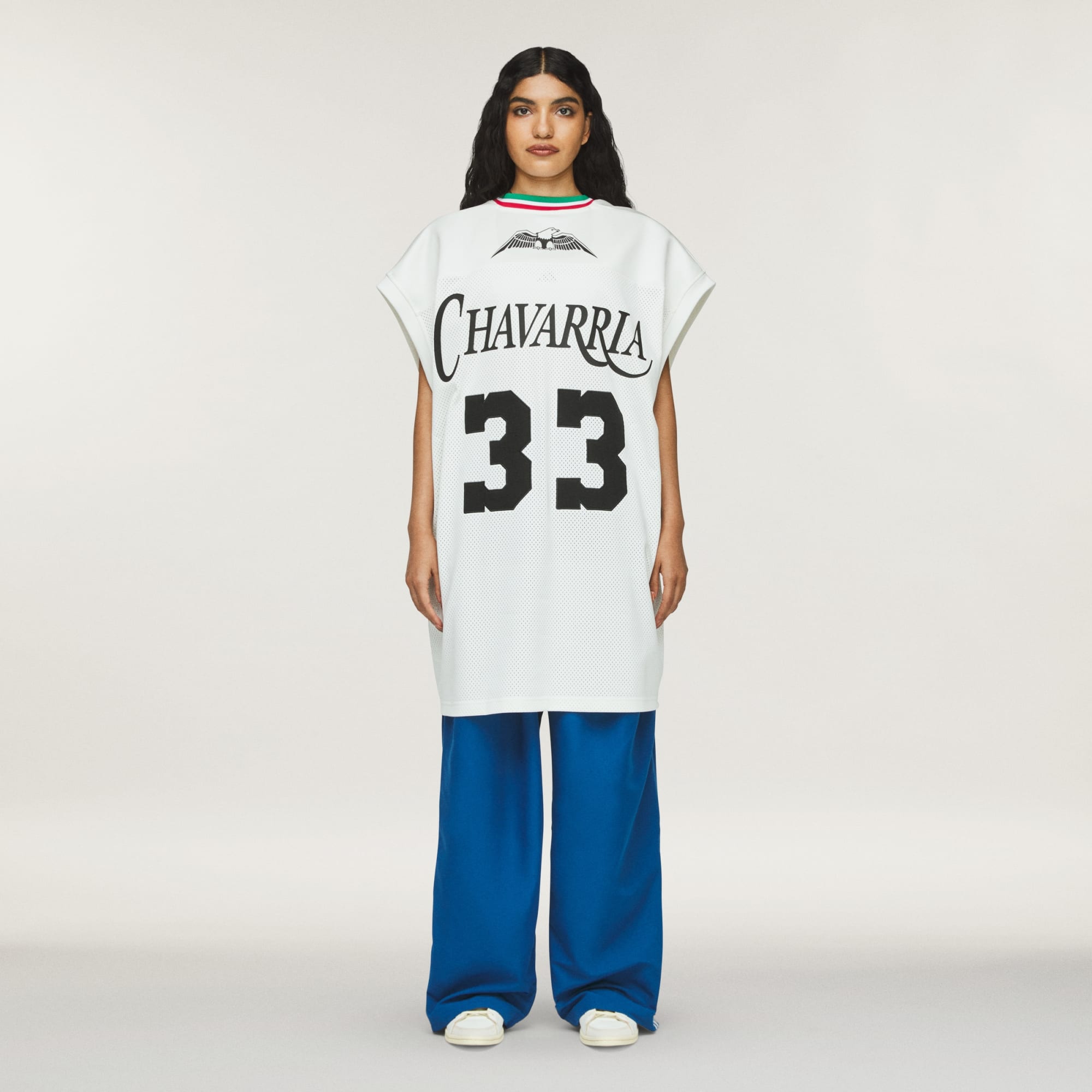 The Chavarria Basketball Jersey is elevated in a mix of heavyweight mesh and double knit spacer fabric to provide exceptional quality and comfort. The basketball jersey is designed with voluminous proportions in the body. Functional details include a ribbed three-stripe collar. Branding is symbolized through embroidered double trefoils on the center front chest, an embroidered Chavarria logo and 33 on the back. Adidas applied 3 strips run down the sides of the body.