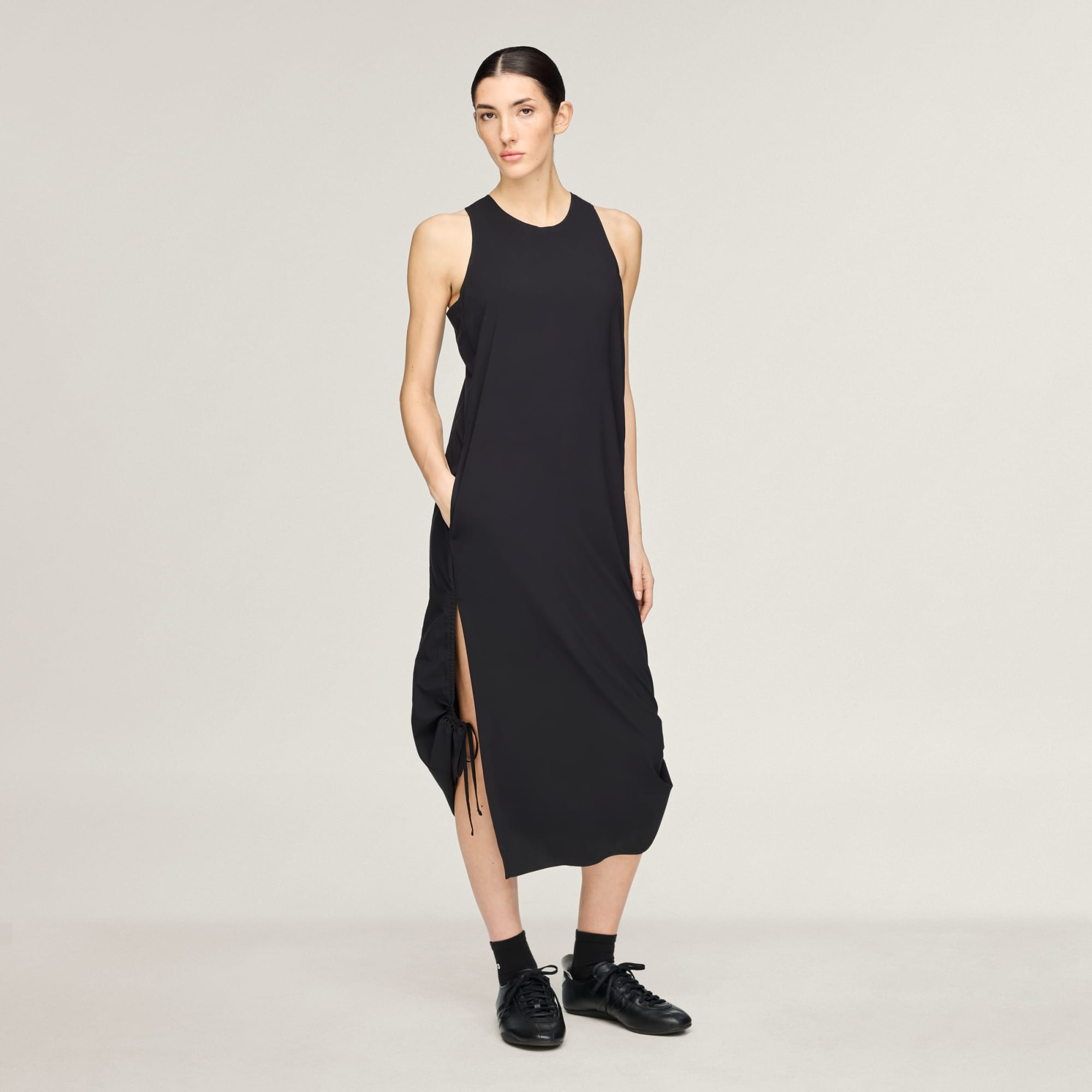 Sleeveless dress with cinch straps for adaptive styling.