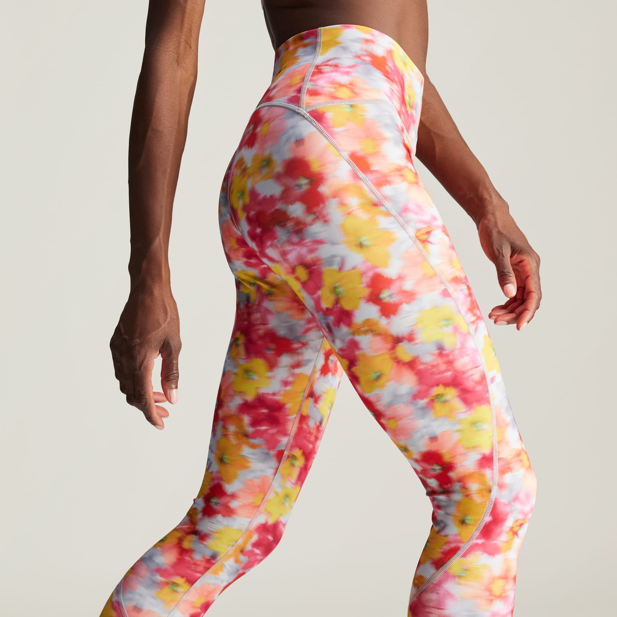 Belirli oranda geri dönüştürülmüş malzemelerle üretilen, parlak çiçek desenli tayt