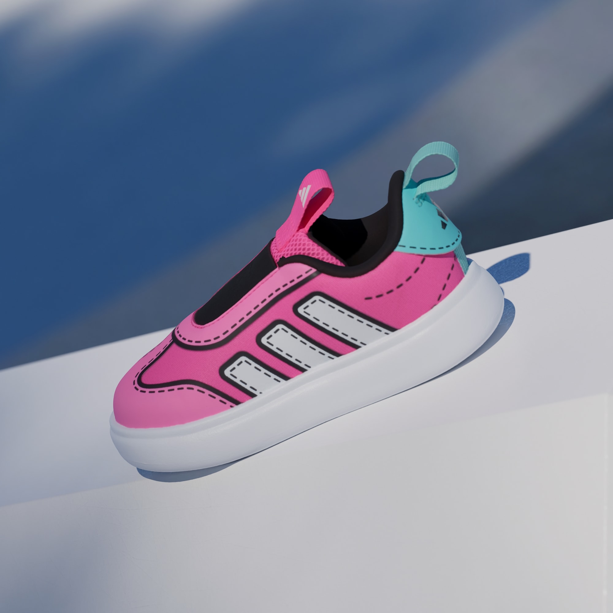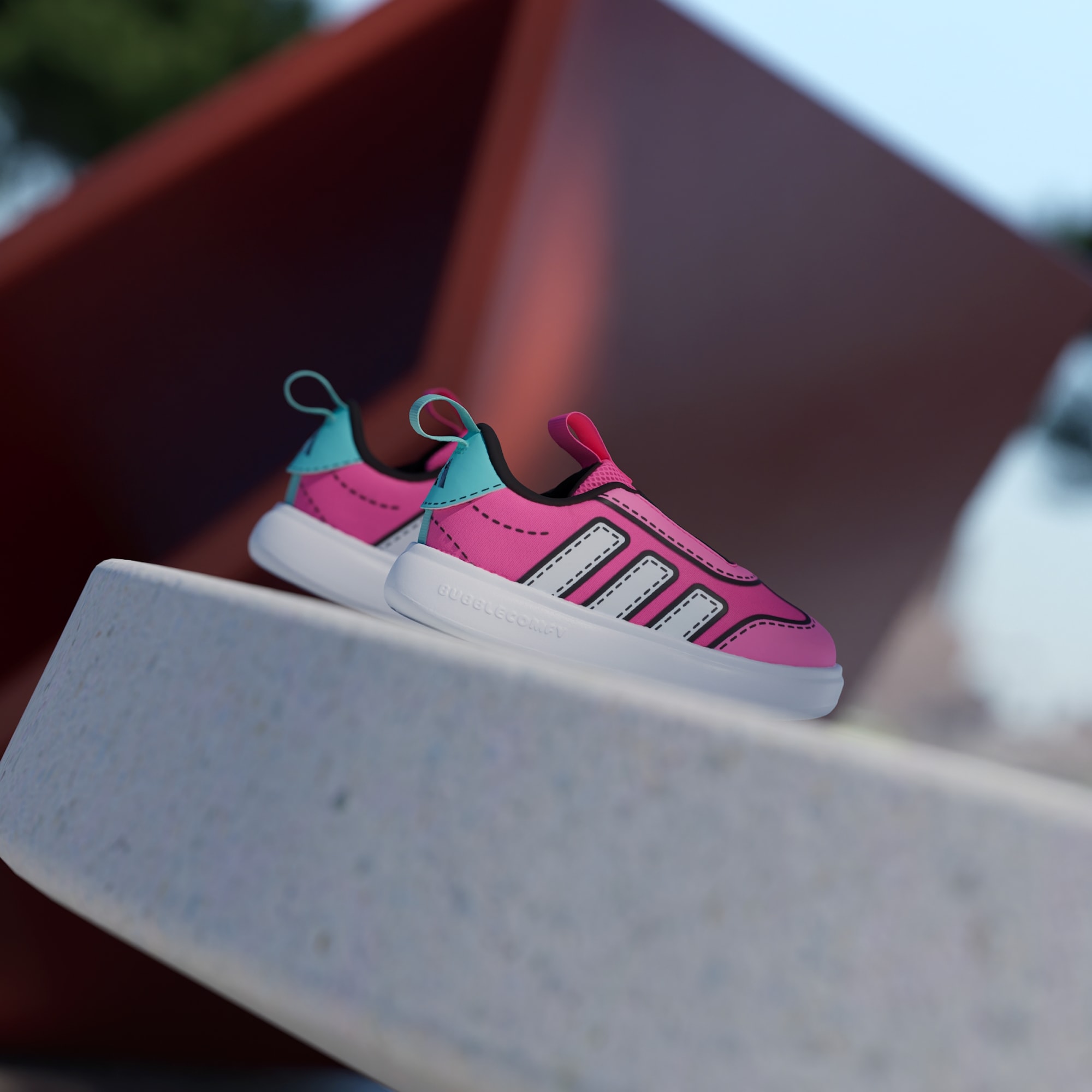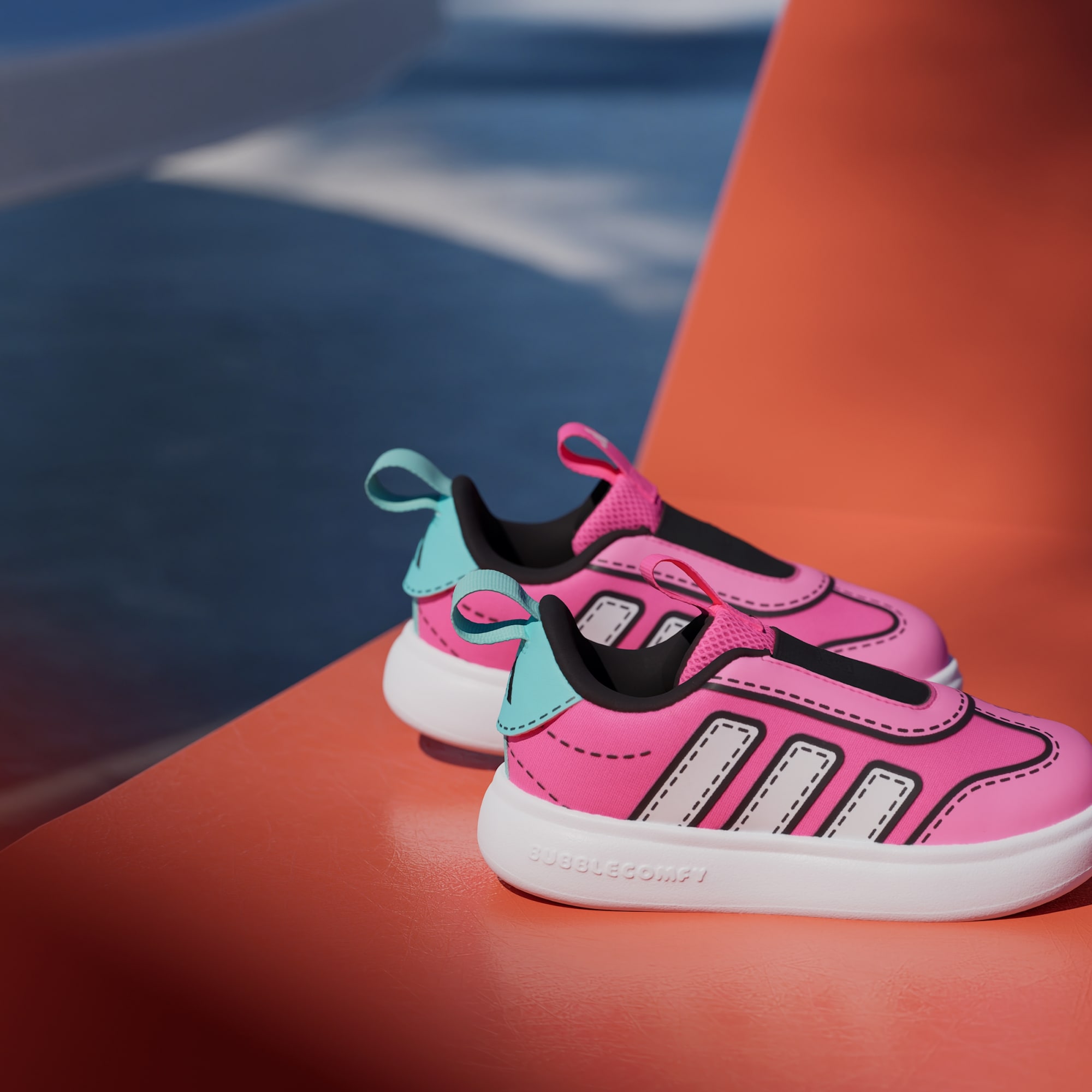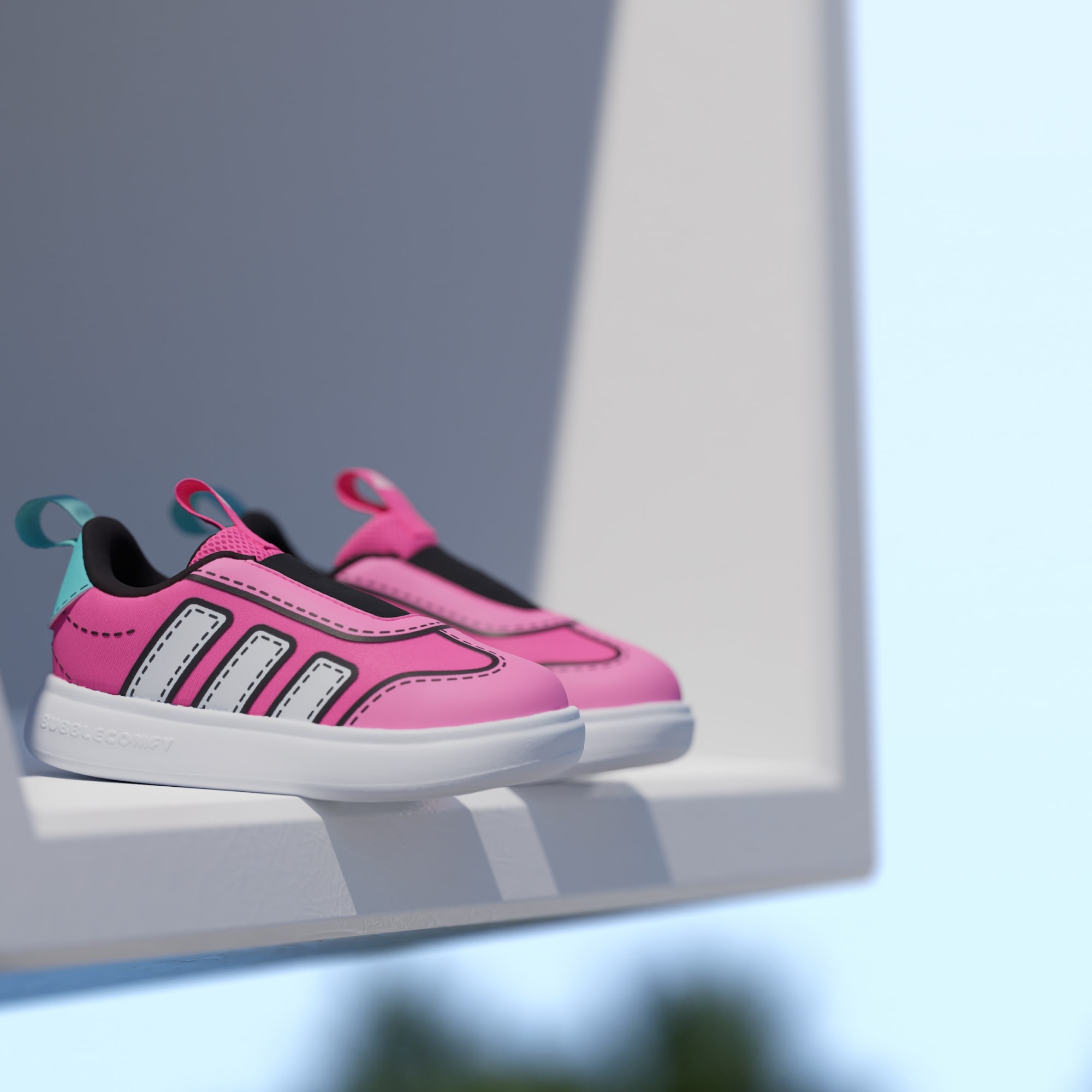 Çocuklar, Bubblecomfy Ayakkabıyı her giydiklerinde rengarenk ve eğlenceli bir dünyada kendilerini kaybedecekler. Minik maceracılar için tasarlanan bu ayakkabı, nefes alan file üst yüzeyindeki çizgi roman tarzı eğlenceli grafiklerle öne çıkar. Tek parça yumuşak EVA'dan üretilen Bubblecomfy taban üzerine oturan bağcıksız ayakkabı, dil ve topuk kısmındaki çekme halkaları sayesinde kıpır kıpır ayaklara kolayca giydirilir. Bu adidas ayakkabı, miniklerin her ortamda ilgi odağı olmalarını sağlar.