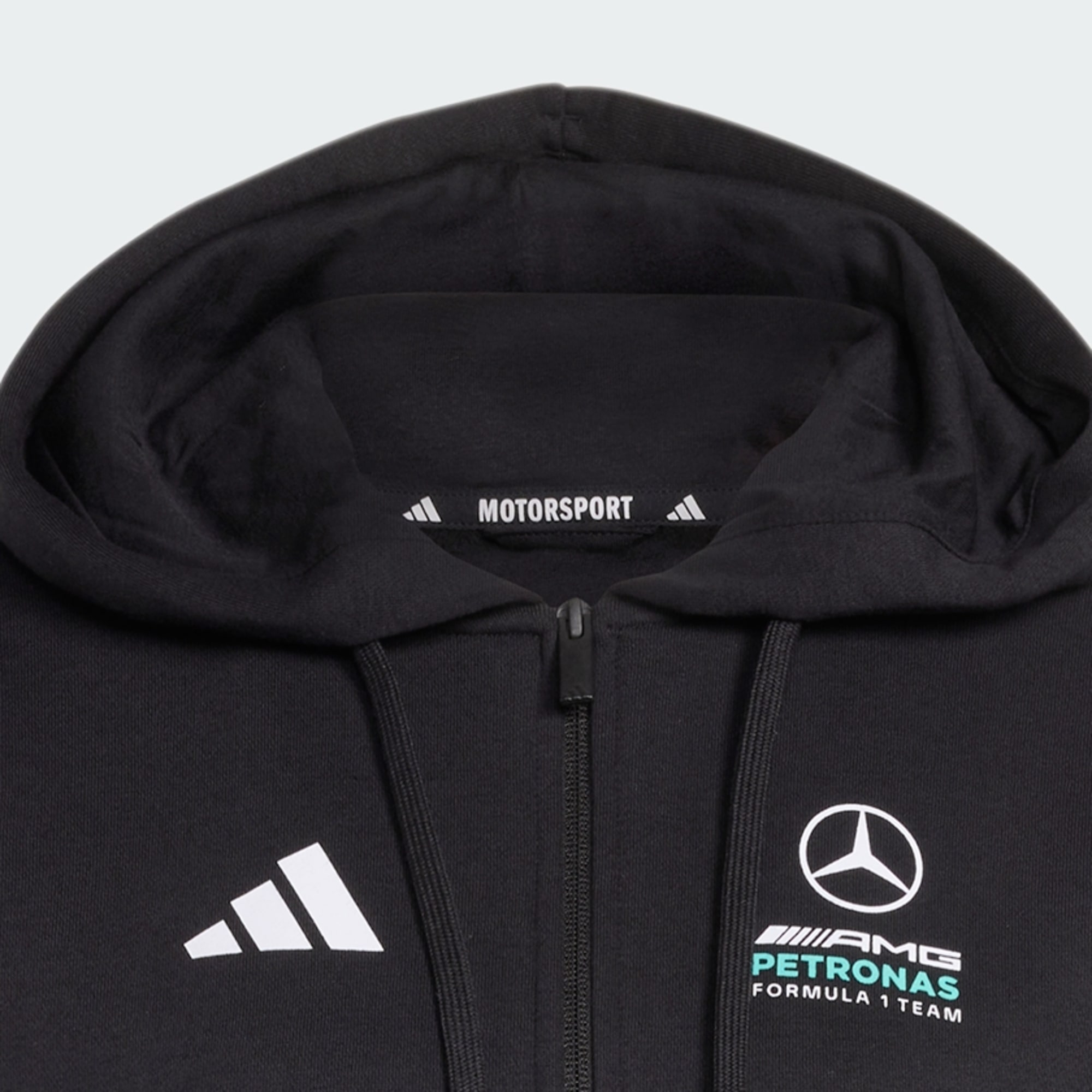 Motor sporları hayranları için Mercedes-AMG Petronas Formula 1 Team detaylarına sahip, tam boy fermuarlı kapüşonlu üst.