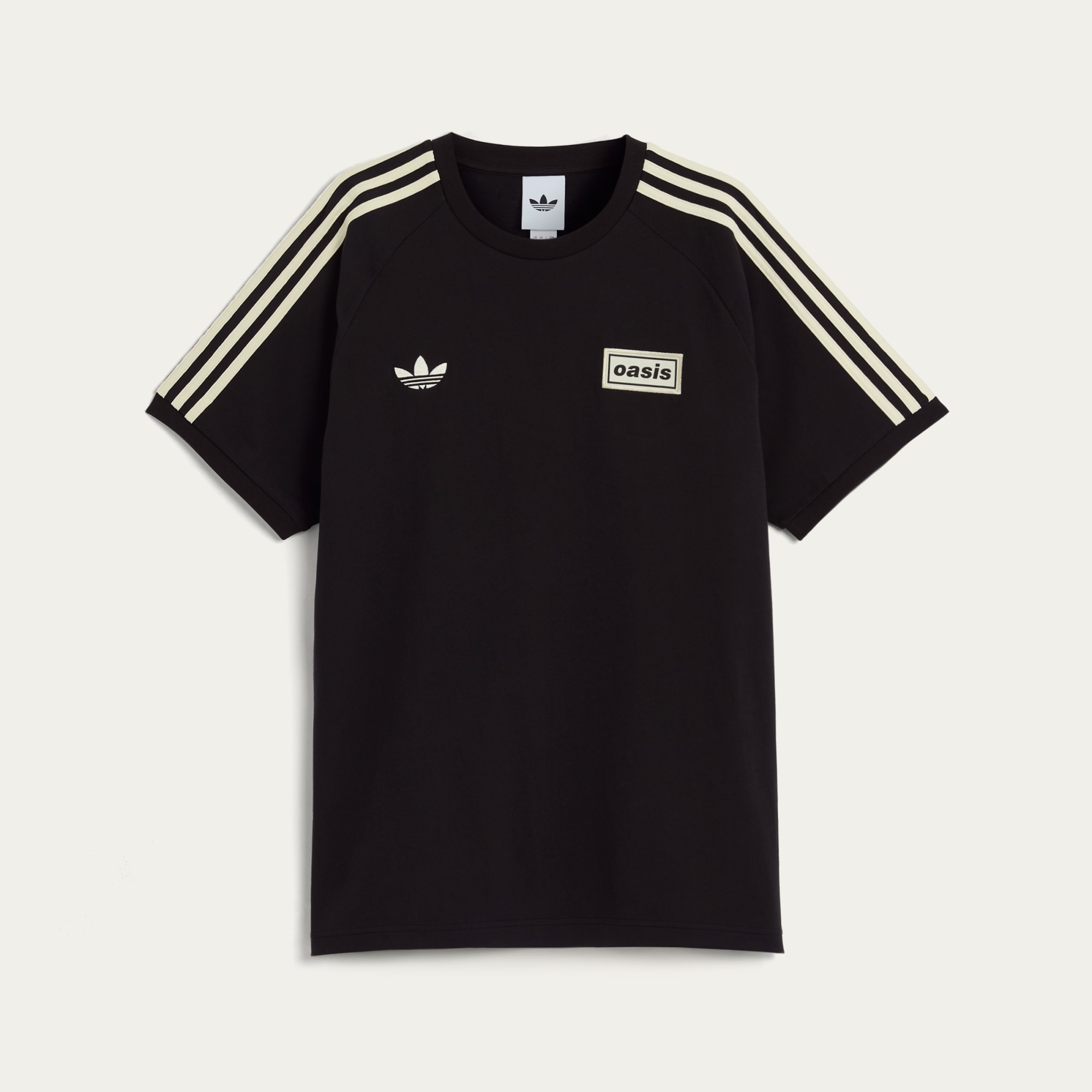 adidas Originals x Oasis marka logolu, vintage esintili, The Band With The 3 Stripes imzalı kısa kollu tişört.