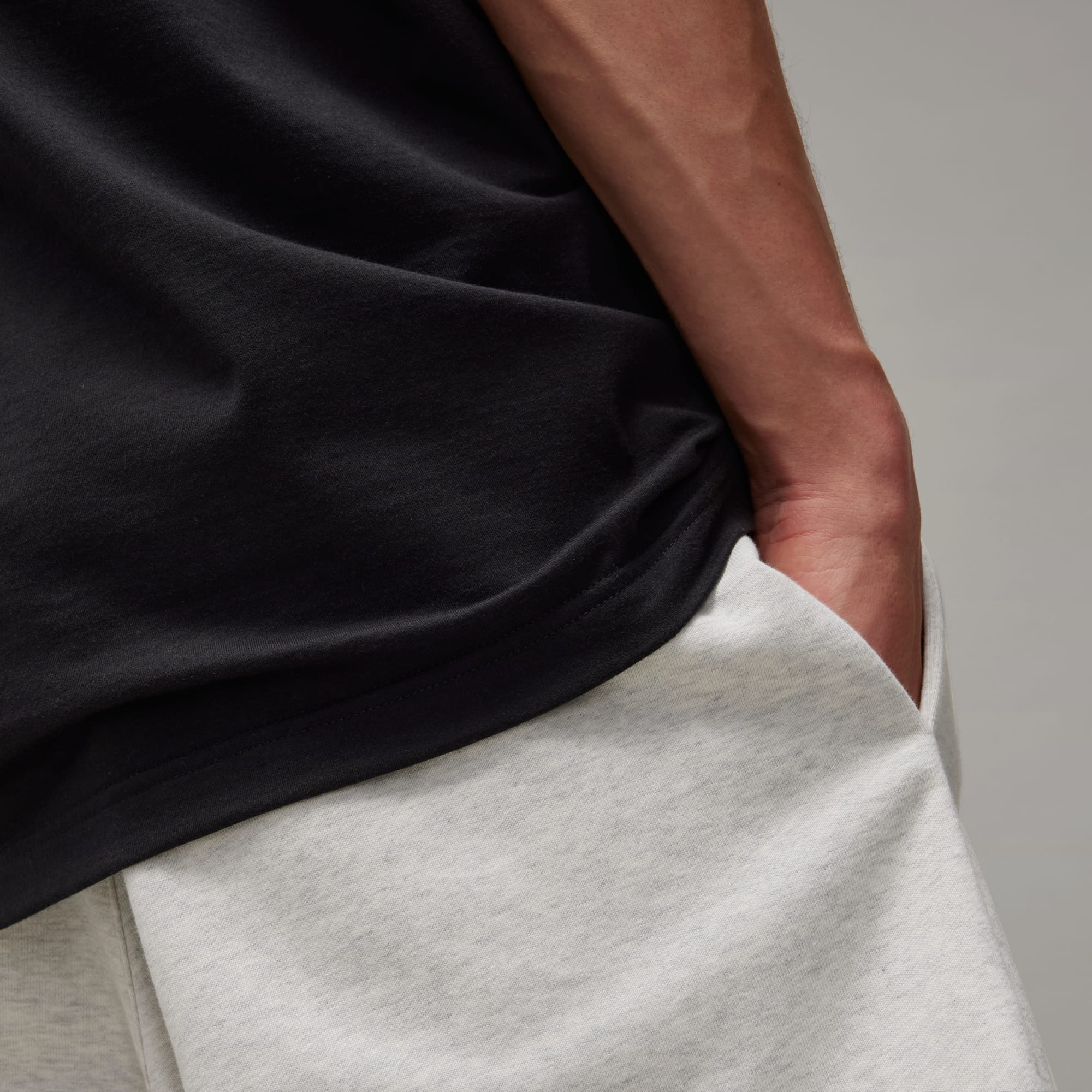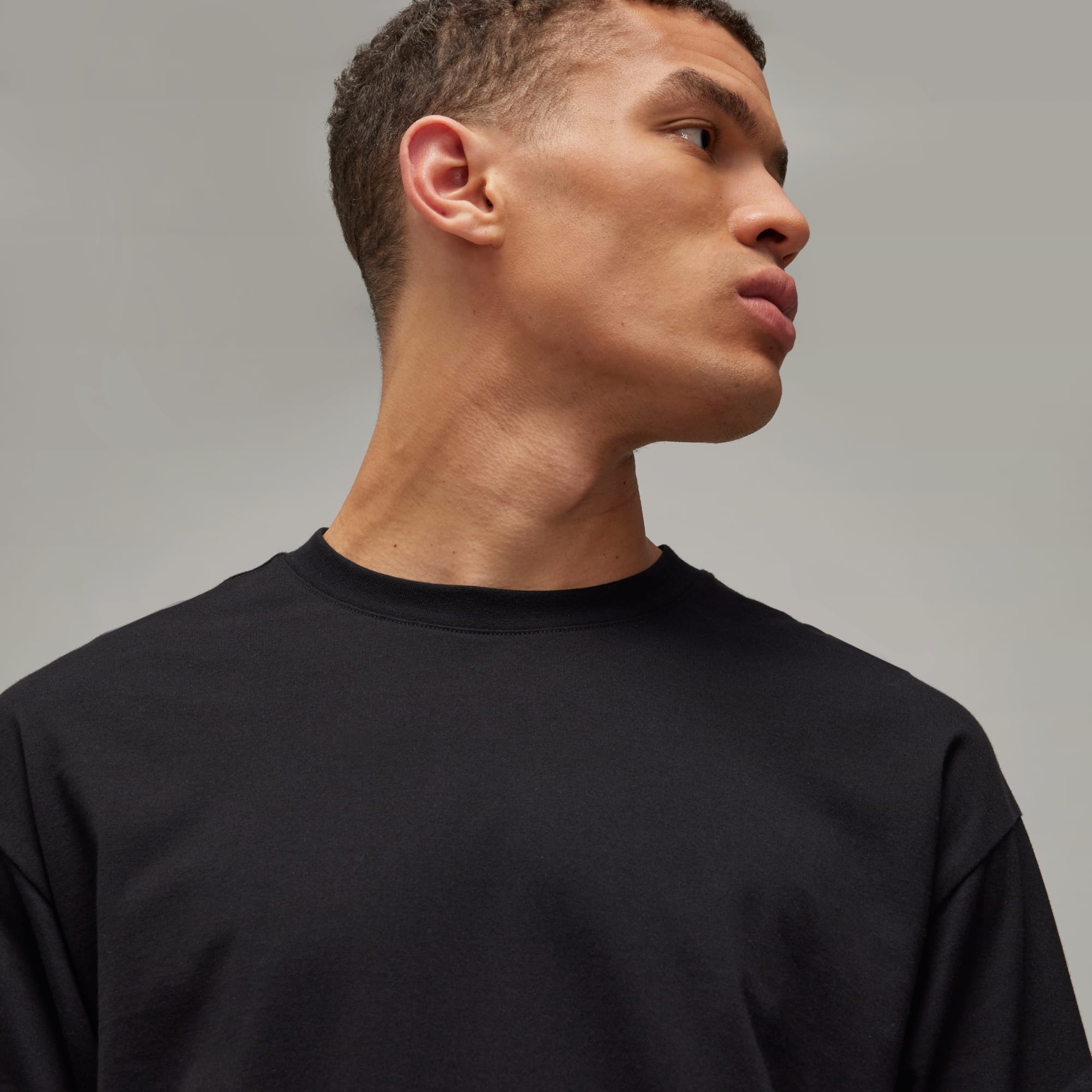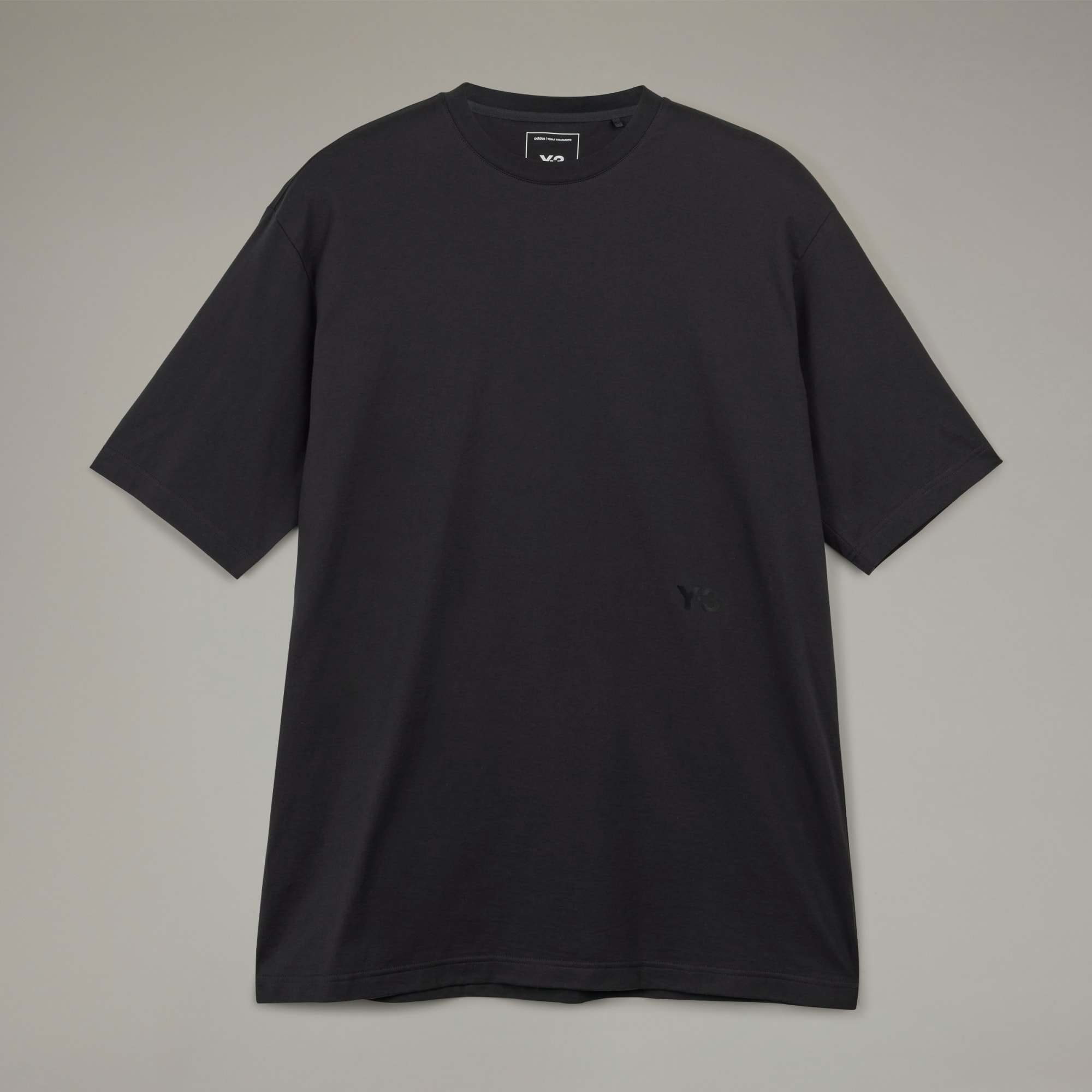 Y-3 markalı, doğayla uyumlu, köşeli kesime sahip kısa kollu tişört.