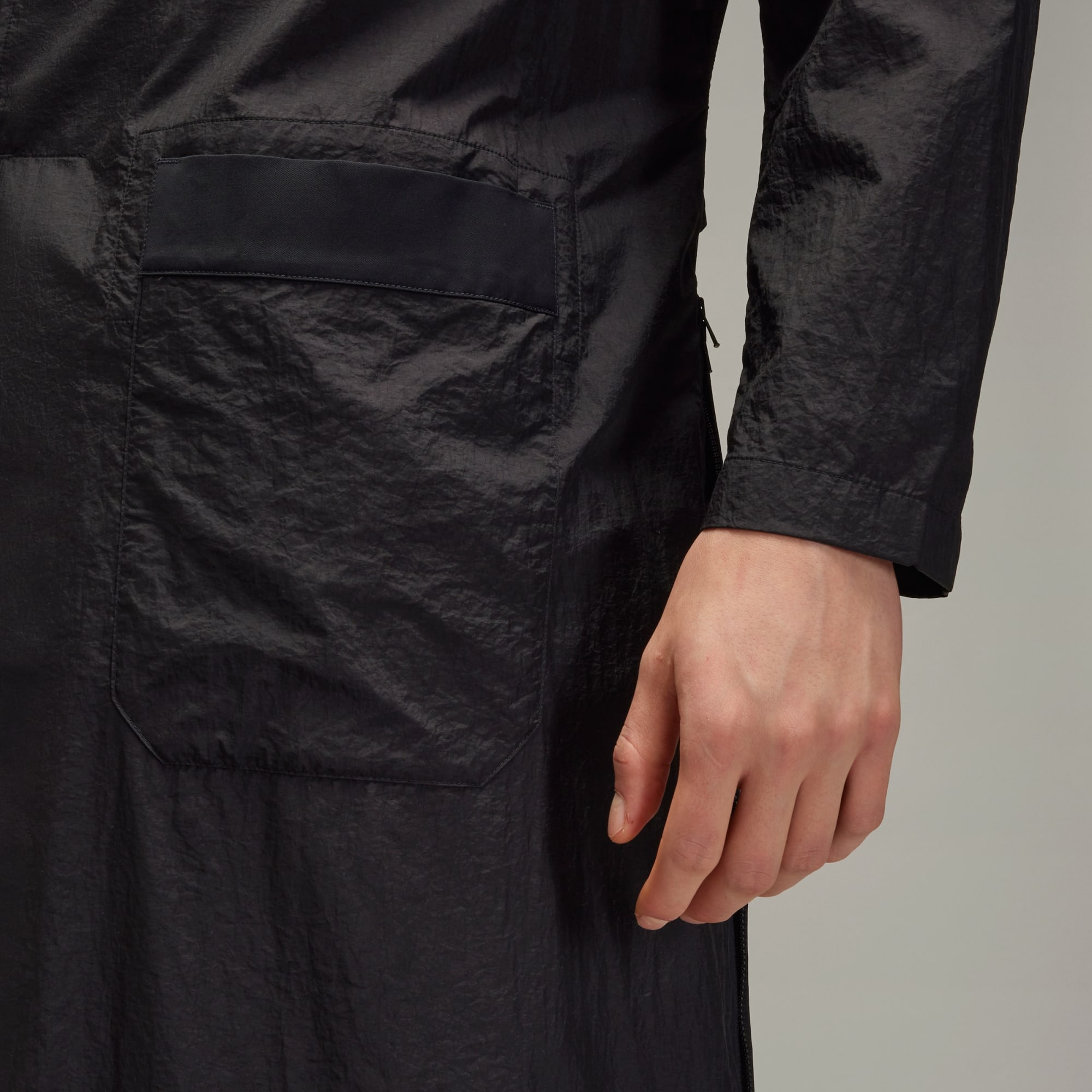 Y-3 Ultralight Naylon Blazer Palto, adidas ve Yohji Yamamoto arasındaki uzun soluklu işbirliğinin mükemmel bir örneği. Yalın tasarımlı siluet, vücudu zarif bir dökümlü havayla sararak sadece duruşuyla bile dramatik bir görünüm sunar. Arka fermuarlar, alt gövdeyi açarak daha akıcı ve kişiselleştirilebilir bir oyun alanı yaratmana olanak tanır. Farklı malzemelerin karışımı, bazı yerlerde naylon tafta, diğer yerlerde ise rayon düz dokuma kumaş ile tasarımda uyumu öne çıkarır.
